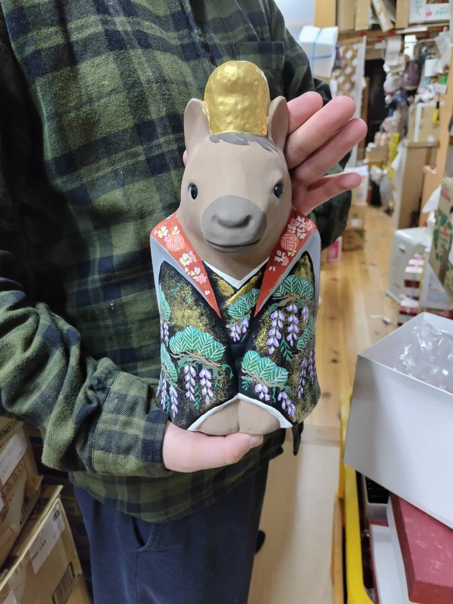 サイズ:高さ23cm×横幅12.5cm×奥行き12cm 説明:来年の干支である午をモチーフとした京陶人形です。腰に手を当て勇気づけるように、来年も大丈夫、と背中を後押ししてくれる人形になります。来年も良い年で有りますようにと願いを込めて制作致しました。