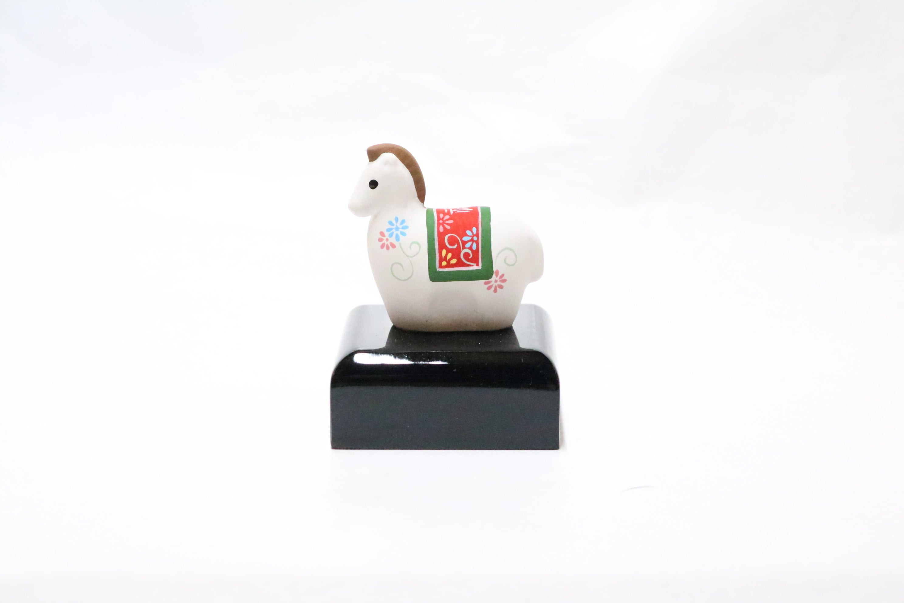 説明:来年の干支である午をモチーフとした京陶人形です。可愛らしいサイズの午に華やかな唐草模様を描いております。また人形が転倒しないように台座に棒がセットされておりますので、場所を選ばずに飾ることが出来ます。
