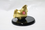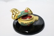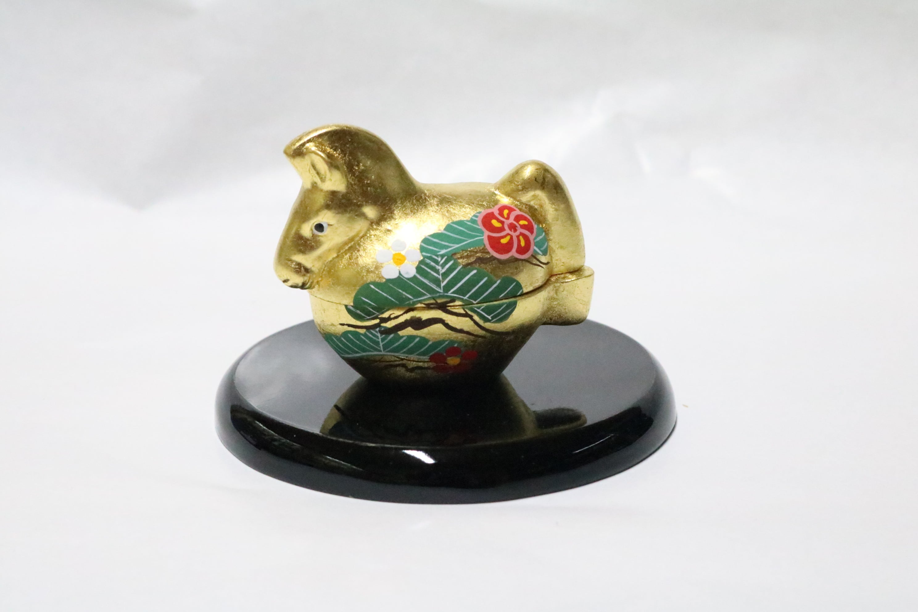 説明:金箔をあしらった小判の上に干支がいる香合になります。干支の午はかわいく、側面に鮮やかな梅と松、そして福の文字を描いております。中はシンプルな色合いになります。